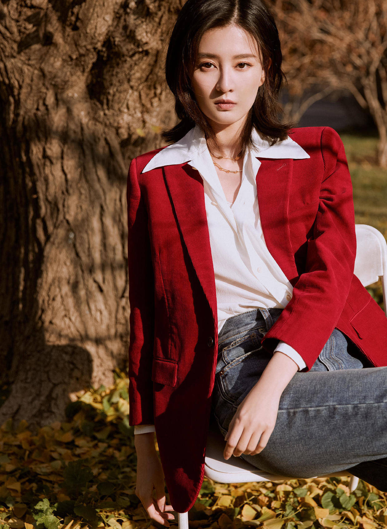 搭配红色西装时,可融入基础色调和整体视觉效果,避免视觉疲劳,增添知性气质。